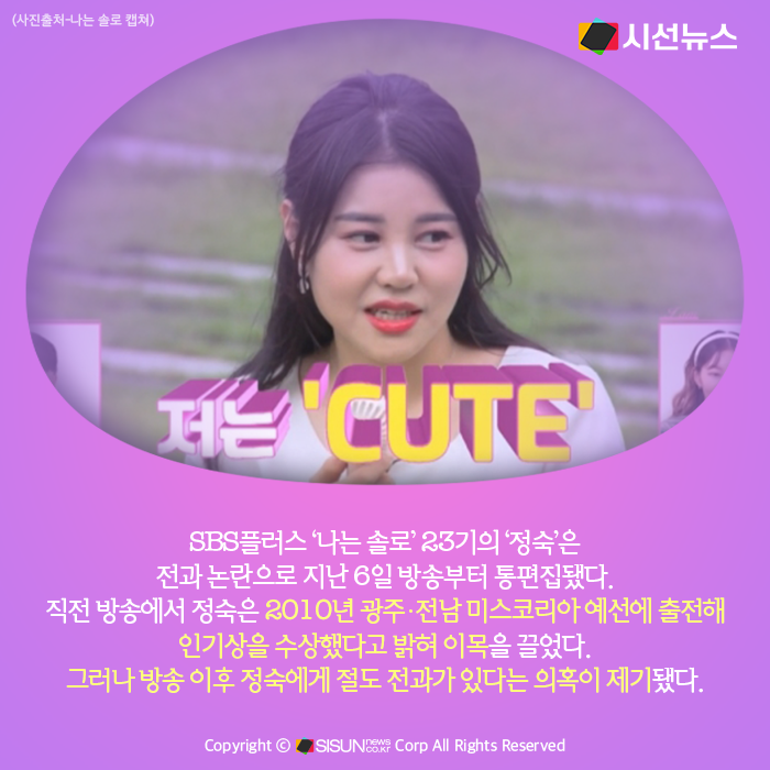 SBS플러스 ‘나는 솔로’ 23기의 ‘정숙’은 전과 논란으로 지난 6일 방송부터 통편집됐다. 직전 방송에서 정숙은 2010년 광주·전남 미스코리아 예선에 출전해 인기상을 수상했다고 밝혀 이목을 끌었다. 그러나 방송 이후 정숙에게 절도 전과가 있다는 의혹이 제기됐다.