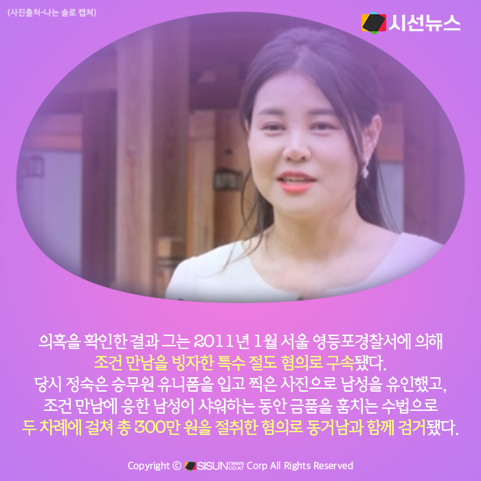의혹을 확인한 결과 그는 2011년 1월 서울 영등포경찰서에 의해 조건 만남을 빙자한 특수 절도 혐의로 구속됐다. 당시 정숙은 승무원 유니폼을 입고 찍은 사진으로 남성을 유인했고, 조건 만남에 응한 남성이 샤워하는 동안 금품을 훔치는 수법으로 두 차례에 걸쳐 총 300만 원을 절취한 혐의로 동거남과 함께 검거됐다.