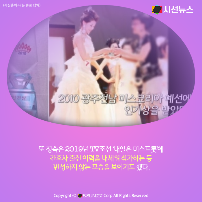 또 정숙은 2019년 TV조선 ‘내일은 미스트롯’에 간호사 출신 이력을 내세워 참가하는 등 반성하지 않는 모습을 보이기도 했다.