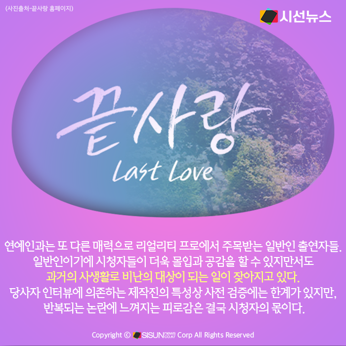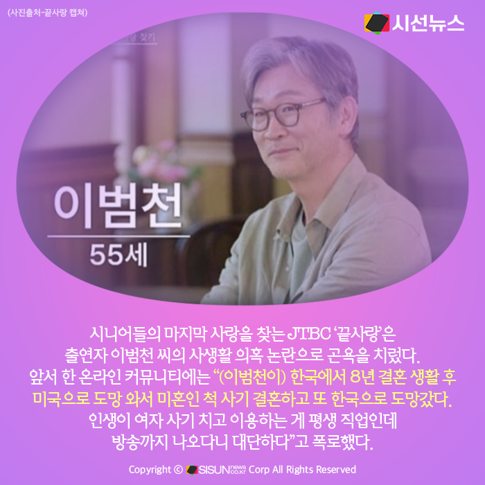 시니어들의 마지막 사랑을 찾는 JTBC ‘끝사랑’은 출연자 이범천 씨의 사생활 의혹 논란으로 곤욕을 치렀다. 앞서 한 온라인 커뮤니티에는 “(이범천이) 한국에서 8년 결혼 생활 후 미국으로 도망 와서 미혼인 척 사기 결혼하고 또 한국으로 도망갔다. 인생이 여자 사기 치고 이용하는 게 평생 직업인데 방송까지 나오다니 대단하다”고 폭로했다. 또 다른 네티즌도 “옛날 나랑 같이 일했던 동생 남편이다. 이 동네 알 만한 사람들은 다 안다. 삼혼 마지막 부인은 아직 서류 정리가 안 된 상태”라고 주장해 논란이 가중됐다.