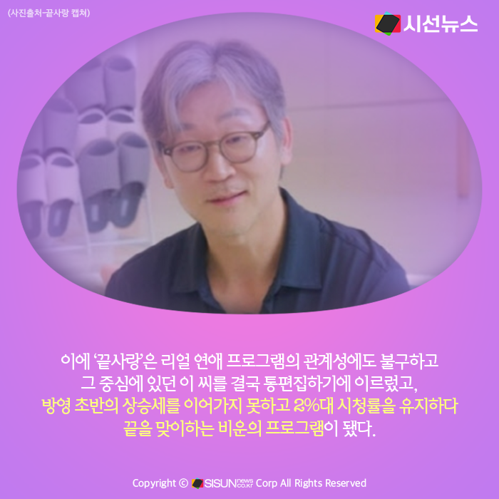 이에 ‘끝사랑’은 리얼 연애 프로그램의 관계성에도 불구하고 그 중심에 있던 이 씨를 결국 통편집하기에 이르렀고, 방영 초반의 상승세를 이어가지 못하고 2%대 시청률을 유지하다 끝을 맞이하는 비운의 프로그램이 됐다.