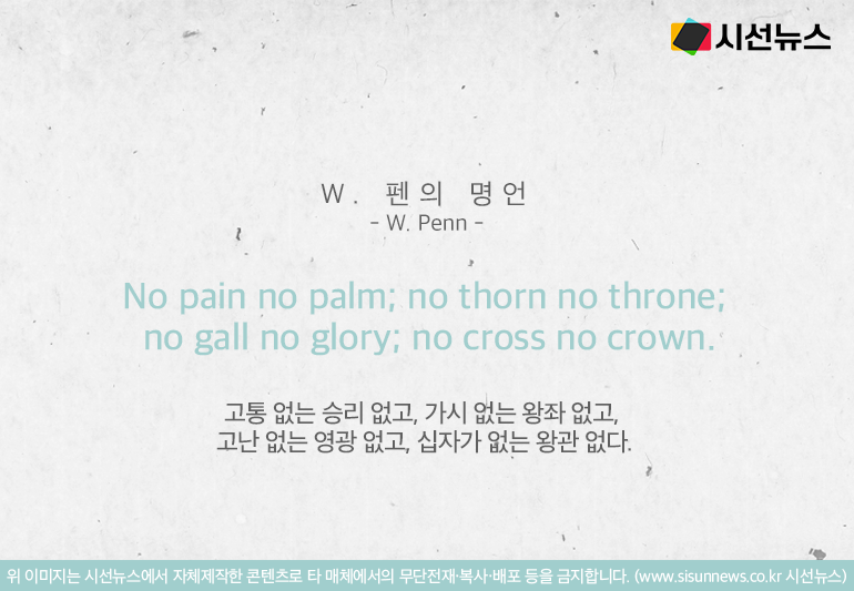 ‘고통 없는 승리 없고, 가시 없는 왕좌 없고, 고난 없는 영광 없고, 십자가 없는 왕관 없다.’ <W. 펜>