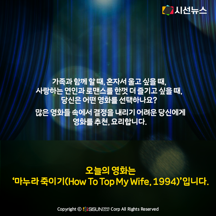 시선뉴스=박진아 기자ㅣ가족과 함께 할 때, 혼자서 울고 싶을 때, 사랑하는 연인과 로맨스를 한껏 더 즐기고 싶을 때, 당신은 어떤 영화를 선택하나요? 많은 영화들 속에서 결정을 내리기 어려운 당신에게 영화를 추천, 요리합니다. 오늘의 영화는 ‘마누라 죽이기(How To Top My Wife, 1994)’입니다.
