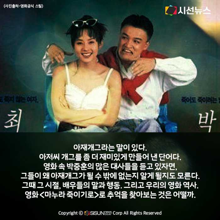 아재개그라는 말이 있다. 아저씨 개그를 좀 더 재미있게 만들어 낸 단어다. 영화 속 박중훈의 많은 대사들을 듣고 있자면, 그들이 왜 아재개그가 될 수밖에 없는지 알게 될지도 모른다. 그때 그 시절, 배우들의 말과 행동. 그리고 우리의 영화 역사. 영화 <마누라 죽이기로>로 추억을 찾아보는 것은 어떨까.