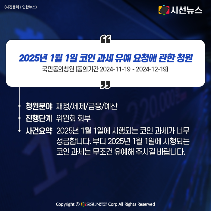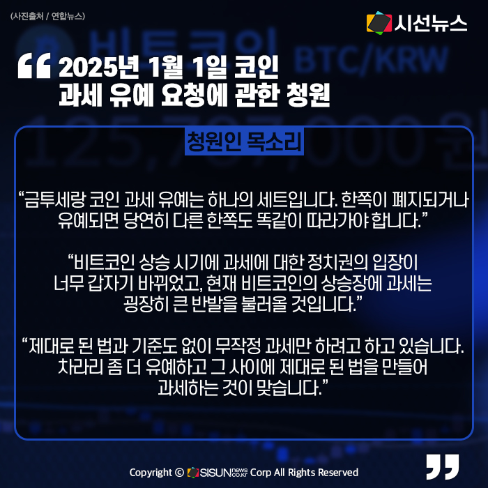 셋째, 비트코인의 상승장에 과세는 굉장히 큰 반발을 불러올 것입니다. 현재 비트코인은 반감기에, 미국 트럼프 대통령 당선에, 전고점 돌파까지 맞물려 상승 시기에 접어들었습니다. 그리고 수많은 사람들이 여기에 기대를 하고 있고 목숨까지 걸고 있습니다. 21년도에 소위 빚투를 해서 큰 손실이 난 사람들, 돈이 없어 전전긍긍하는 사람들이 이제야 원금 복구를 할 수 있다는, 조금이라도 돈을 벌어볼 수 있다는 큰 기대감을 갖고 있습니다. 그런데 이 시기에 과세를 하고 22%를 가져간다면 큰 반발이 생길 것입니다. 물론 무리한 투자를 옹호하는 것은 아닙니다. 투자는 어디까지나 자신이 감당할 수 있는 선에서 해야지요. 하지만 설사 잘못된 투자를 했다 하더라도 그 사람들한테는 마지막 기회일 수 있는데 이 시기에 과세를 하다니요? 그 사람들의 희망을 짓밟고 싶은 건가요? 제발 그런 선택을 하지 않았으면 좋겠습니다.