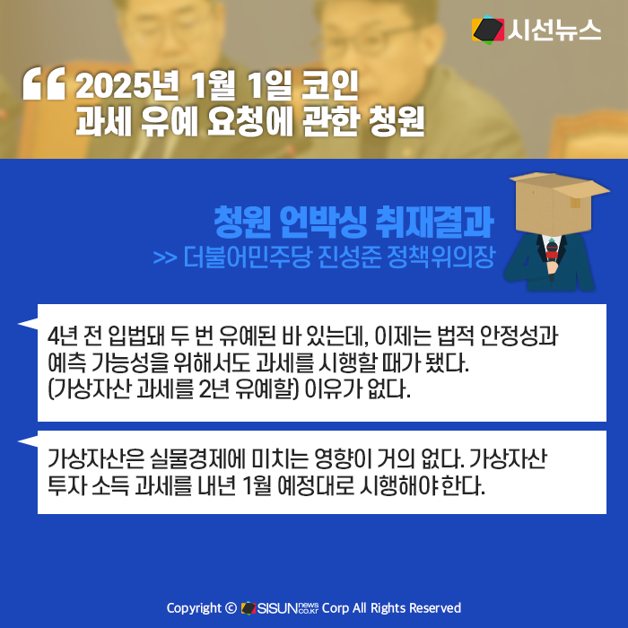 “가상자산은 실물경제에 미치는 영향이 거의 없다. 가상자산 투자 소득 과세를 내년 1월 예정대로 시행해야 한다.”