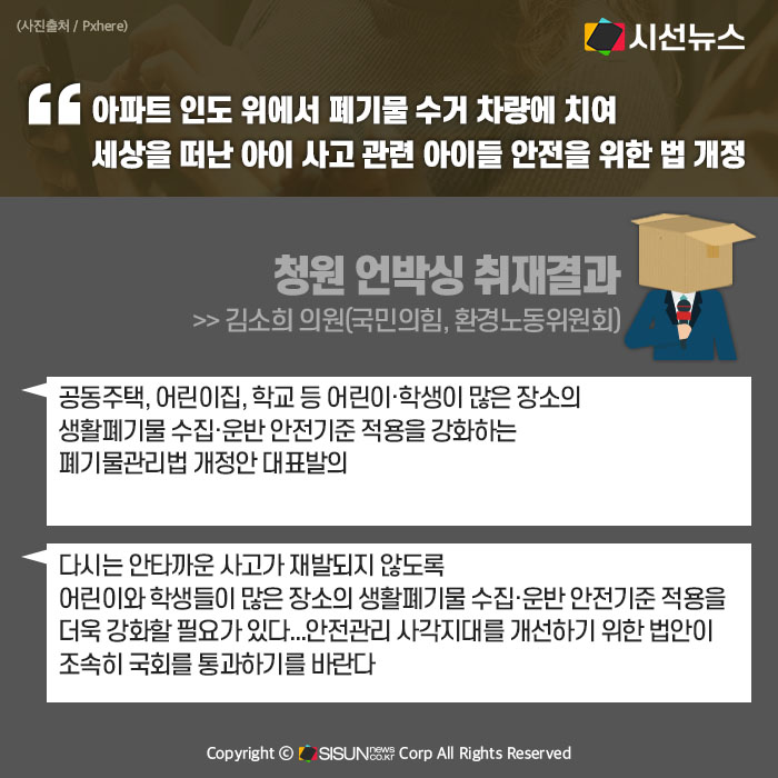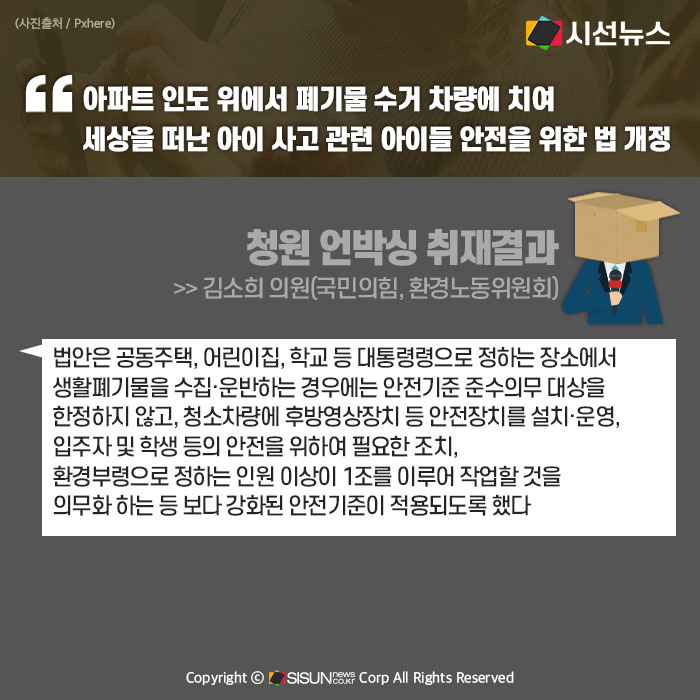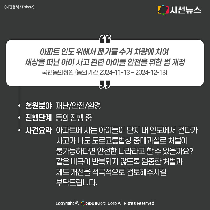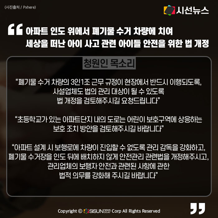 - 아파트 인도 위에서 폐기물 수거 차량에 치여 세상을 떠난 아이 사고 관련 아이들 안전을 위한 법 개정