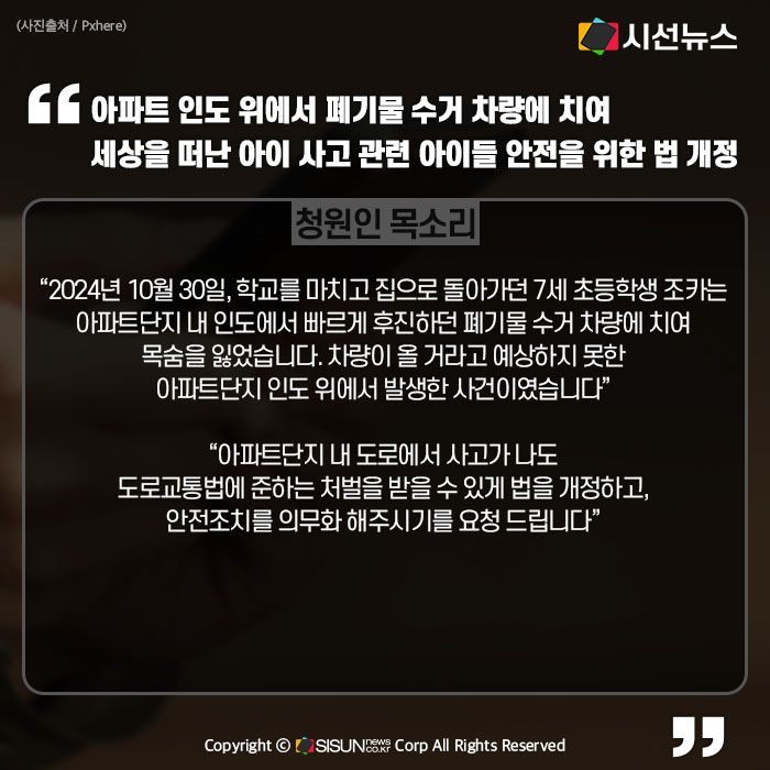 저는 광주광역시 북구 신용동의 한 아파트에서 발생한 안타까운 사고로 사랑하는 조카를 잃은 유가족입니다. 2024년 10월 30일 오후 1시 20분 학교를 마치고 집으로 돌아가던 7세 초등학생 조카는 아파트단지 내 인도에서 빠르게 후진하던 폐기물 수거 차량에 치여 목숨을 잃었습니다. 차량이 올 거라고 예상하지 못한 아파트단지 인도 위에서 발생한 사건이였습니다.