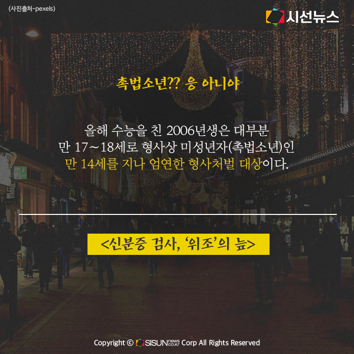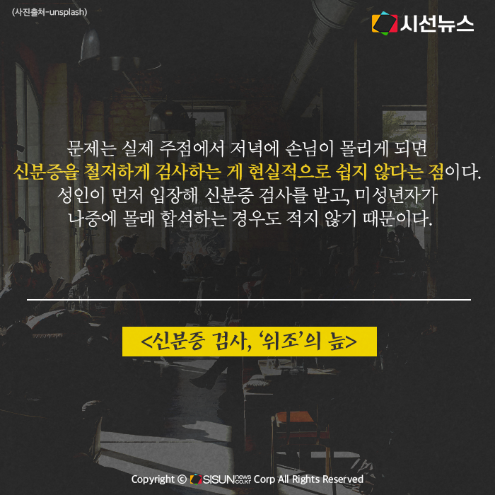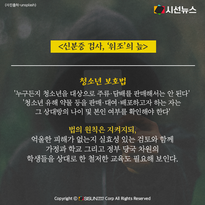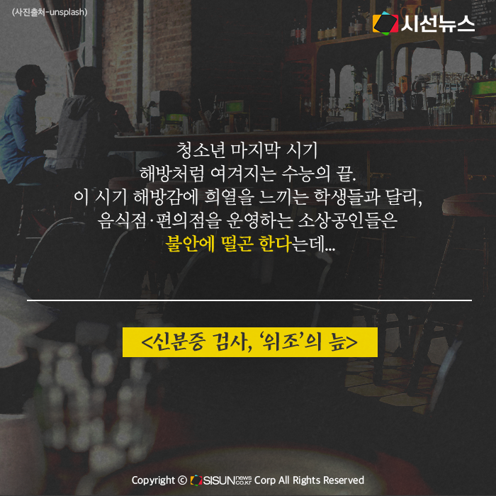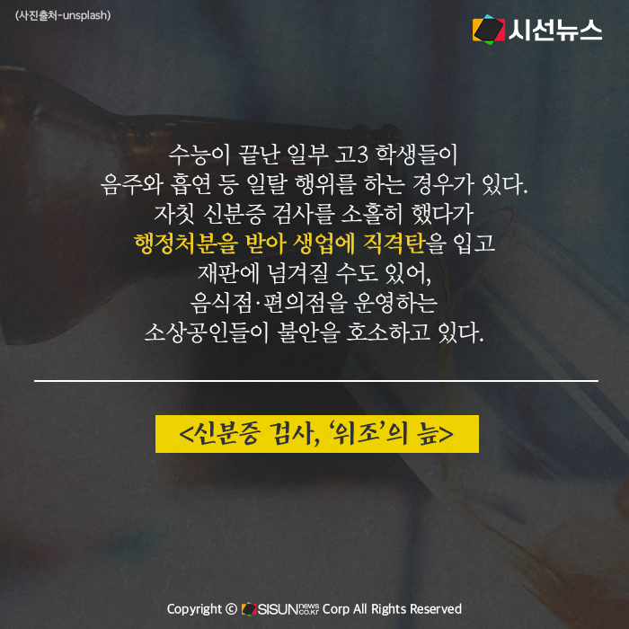 수능이 끝난 일부 고3 학생들이 음주와 흡연 등 일탈 행위를 하는 경우가 있어 자칫 신분증 검사를 소홀히 했다가 행정처분을 받아 생업에 직격탄을 입고 재판에 넘겨질 수도 있어, 음식점·편의점을 운영하는 소상공인들이 불안을 호소하고 있는 것이다. 특히 최근 SNS에는 미성년자가 성인의 신분증을 구한다는 글이 심심치 않게 볼 수 있고, 모바일 신분증이 널리 쓰이기 시작하면서 위·변조에 대한 우려는 더욱 커지는 상황이다.