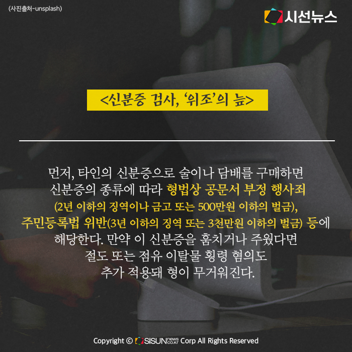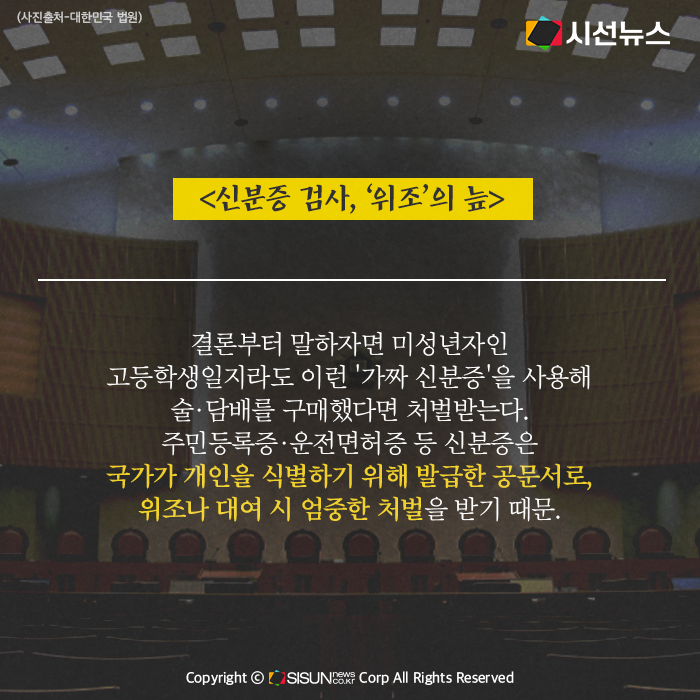 결론부터 말하자면 미성년자인 고등학생일지라도 이런 '가짜 신분증'을 사용해 술·담배를 구매했다면 처벌받는다. 주민등록증·운전면허증 등 신분증은 국가가 개인을 식별하기 위해 발급한 공문서로, 위조나 대여 시 엄중한 처벌을 받기 때문이다.