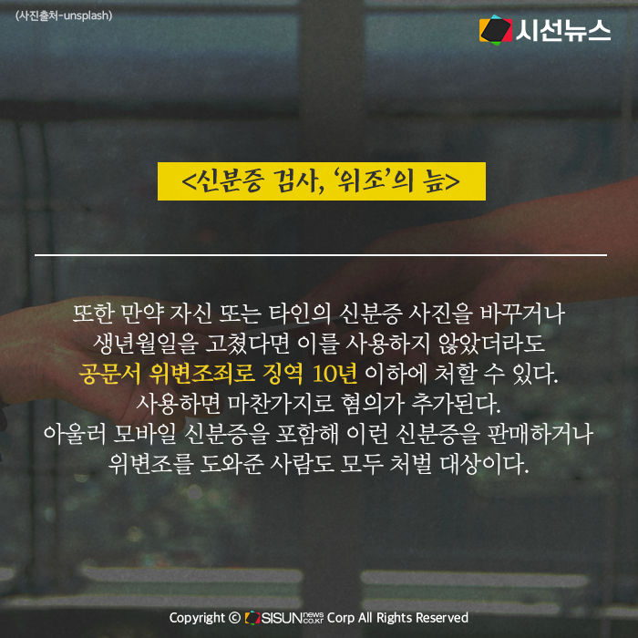 또한 만약 자신 또는 타인의 신분증 사진을 바꾸거나 생년월일을 고쳤다면 이를 사용하지 않았더라도 공문서 위변조죄로 징역 10년 이하에 처할 수 있다. 사용하면 마찬가지로 혐의가 추가된다. 아울러 모바일 신분증을 포함해 이런 신분증을 판매하거나 위변조를 도와준 사람도 모두 처벌 대상이다.