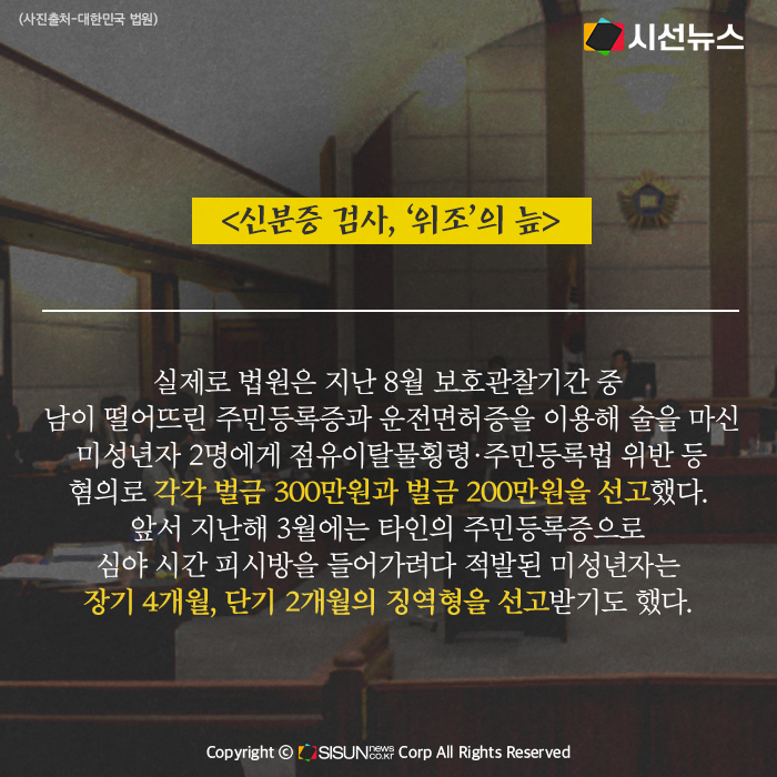 실제로 법원은 지난 8월 보호관찰기간 중 남이 떨어뜨린 주민등록증과 운전면허증을 이용해 술을 마신 미성년자 2명에게 점유이탈물횡령·주민등록법 위반 등 혐의로 각각 벌금 300만원과 벌금 200만원을 선고했다. 앞서 지난해 3월에는 타인의 주민등록증으로 심야 시간 피시방을 들어가려다 적발된 미성년자는 장기 4개월, 단기 2개월의 징역형을 선고받기도 했다.
