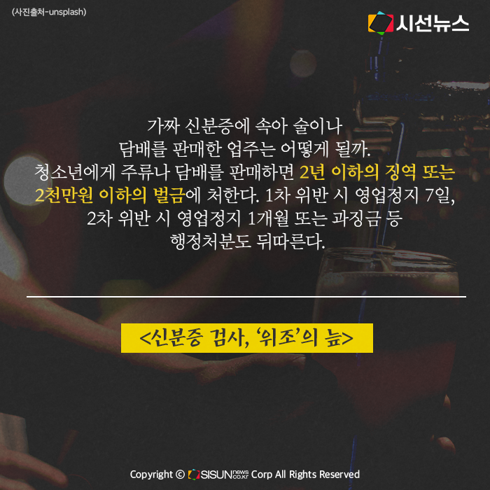 가짜 신분증에 속아 술이나 담배를 판매한 업주는 어떻게 될까. 청소년에게 주류나 담배를 판매하면 2년 이하의 징역 또는 2천만원 이하의 벌금에 처한다. 1차 위반 시 영업정지 7일, 2차 위반 시 영업정지 1개월 또는 과징금 등 행정처분도 뒤따른다.