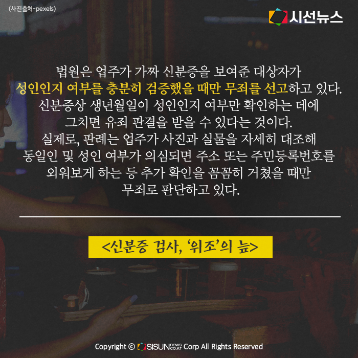법원은 업주가 가짜 신분증을 보여준 대상자가 성인인지 여부를 충분히 검증했을 때만 무죄를 선고하고 있다. 신분증상 생년월일이 성인인지 여부만 확인하는 데에 그치면 유죄 판결을 받을 수 있다는 것이다. 실제로, 판례는 업주가 사진과 실물을 자세히 대조해 동일인 및 성인 여부가 의심되면 주소 또는 주민등록번호를 외워보게 하는 등 추가 확인을 꼼꼼히 거쳤을 때만 무죄로 판단하고 있다.