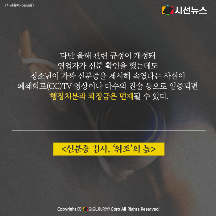 다만 올해 관련 규정이 개정돼 영업자가 신분 확인을 했는데도 청소년이 가짜 신분증을 제시해 속였다는 사실이 폐쇄회로(CC)TV 영상이나 다수의 진술 등으로 입증되면 행정처분과 과징금은 면제될 수 있다. 문제는 실제 주점에서 저녁에 손님이 몰리게 되면 신분증을 철저하게 검사하는 게 현실적으로 쉽지 않다는 점이다. 성인이 먼저 입장해 신분증 검사를 받고, 미성년자가 나중에 몰래 합석하는 경우도 적지 않기 때문이다. 업주로서는 정확하고 꼼꼼한 신분증 검사와 더불어 증거 확보만이 억울한 처벌을 피할 수 있는 유일한 방법인 셈이다.