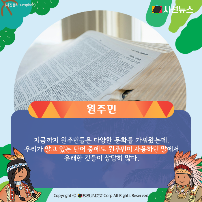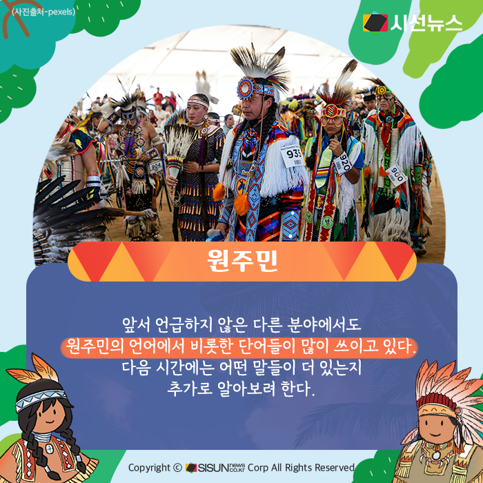 시선뉴스=정혜인 기자 / 디자인=김선희 proㅣ‘인디언’으로 알려진 북미 원주민의 삶을 조명하는 전시‘우리가 인디언으로 알던 사람들’이 지난 6월 국립중앙박물관에서 열렸다. 이 전시에는 미국 덴버박물관이 함께 했다. 지금까지 원주민들은 다양한 문화를 가꿔왔는데, 우리가 알고 있는 단어 중에도 원주민이 사용하던 말에서 유래한 것들이 상당히 많다.