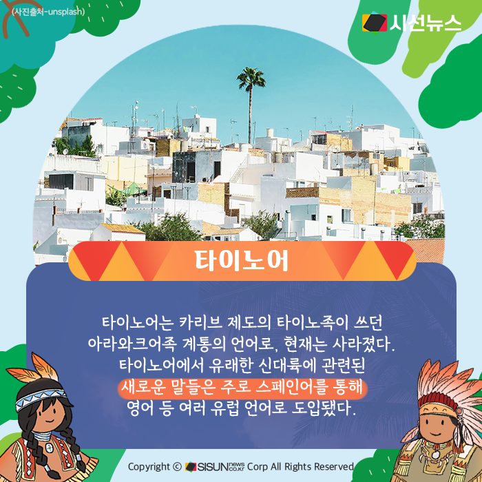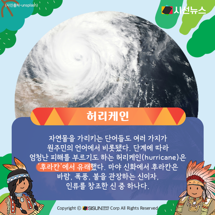 자연물을 가리키는 단어들도 여러 가지가 원주민의 언어에서 비롯됐다. 단계에 따라 엄청난 피해를 부르기도 하는 허리케인(hurricane)은 ‘후라칸’에서 유래했다. 마야 신화에서 후라칸은 바람, 폭풍, 불을 관장하는 신이자, 인류를 창조한 신 중 하나다.