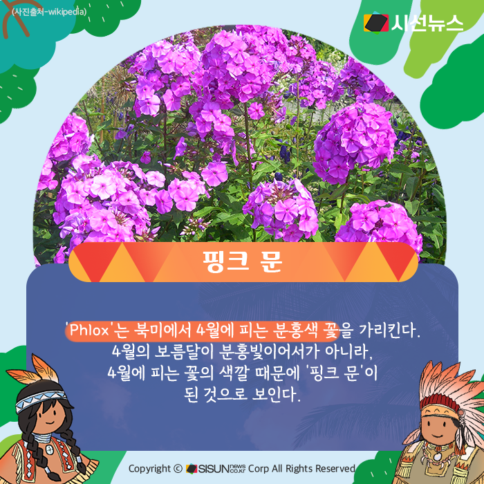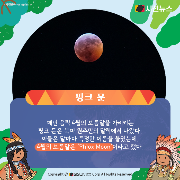매년 음력 4월의 보름달을 가리키는 핑크 문은 북미 원주민의 달력에서 나왔다. 이들은 달마다 특정한 이름을 붙였는데, 4월의 보름달은 ‘Phlox Moon’이라고 했다. ‘Phlox’는 북미에서 4월에 피는 분홍색 꽃을 가리킨다. 4월의 보름달이 분홍빛이어서가 아니라, 4월에 피는 꽃의 색깔 때문에 ‘핑크 문’이 된 것으로 보인다.