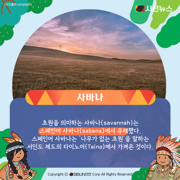초원을 의미하는 사바나(savannah)는 스페인어 사바나(sabana)에서 유래했다. 스페인어 사바나는 ‘나무가 없는 초원’을 말하는 서인도 제도의 타이노어(Taíno)에서 가져온 것이다. 타이노어는 카리브 제도의 타이노족이 쓰던 아라와크어족 계통의 언어로, 현재는 사라졌다. 타이노어에서 유래한 신대륙에 관련된 새로운 말들은 주로 스페인어를 통해 영어 등 여러 유럽 언어로 도입됐다.