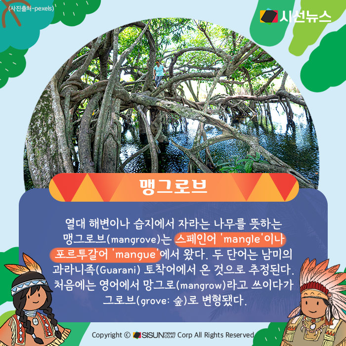 열대 해변이나 습지에서 자라는 나무를 뜻하는 맹그로브(mangrove)는 스페인어 ‘mangle’이나 포르투갈어 ‘mangue’에서 왔다. 두 단어는 남미의 과라니족(Guarani) 토착어에서 온 것으로 추정된다. 처음에는 영어에서 망그로(mangrow)라고 쓰이다가 그로브(grove: 숲)로 변형됐다.
