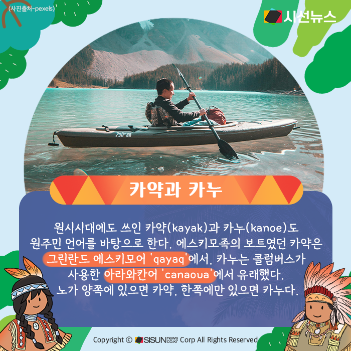 원시시대에도 쓰인 카약(kayak)과 카누(kanoe)도 원주민 언어를 바탕으로 한다. 에스키모족의 보트였던 카약은 그린란드 에스키모어 ‘qayaq’에서, 카누는 콜럼버스가 사용한 아라와칸어 ‘canaoua’에서 유래했다. 노가 양쪽에 있으면 카약, 한쪽에만 있으면 카누다.