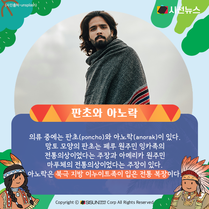 의류 중에는 판초(poncho)와 아노락(anorak)이 있다. 지금은 비옷이라는 의미로 사용되는 망토 모양의 판초는 페루 원주민 잉카족의 전통의상이었다는 주장과 아메리카 원주민 마푸체의 전통의상이었다는 주장이 있다. 아노락은 북극 지방 이누이트족이 입은 전통 복장으로, 지금은 바람막이라는 의미로 쓰인다.