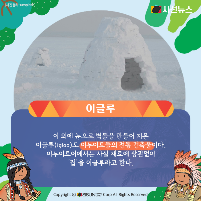 이 외에 눈으로 벽돌을 만들어 지은 이글루(igloo)도 이누이트들의 전통 건축물이다. 이누이트어에서는 사실 재료에 상관없이 ‘집’을 이글루라고 한다. 앞서 언급하지 않은 다른 분야에서도 원주민의 언어에서 비롯한 단어들이 많이 쓰이고 있다. 다음 시간에는 어떤 말들이 더 있는지 추가로 알아보려 한다.