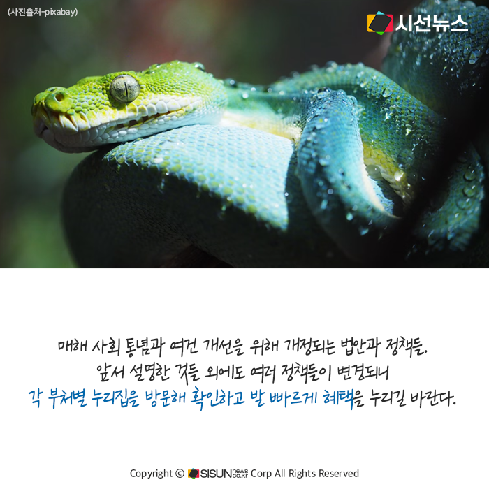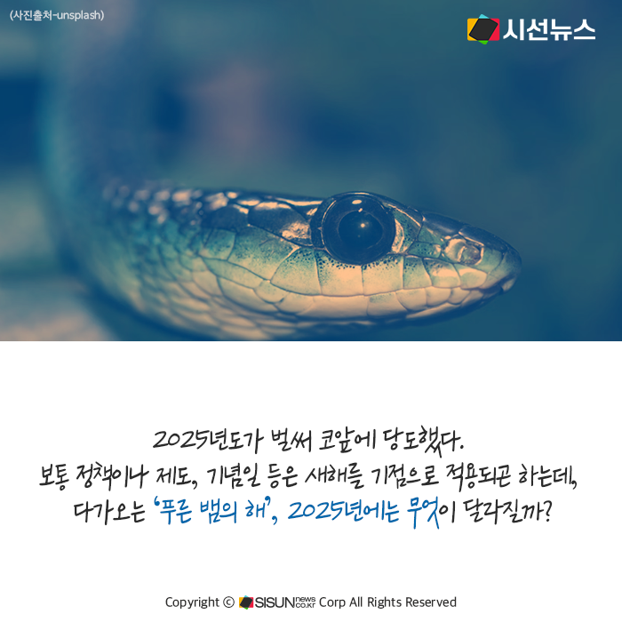 시선뉴스=양원민 기자ㅣ2025년도가 벌써 코앞에 당도했다. 보통 정책이나 제도, 기념일 등은 새해를 기점으로 적용되곤 하는데, 다가오는 ‘푸른 뱀의 해’, 2025년에는 무엇이 달라질까?