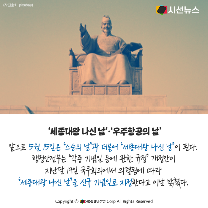 앞으로 5월 15일은 ‘스승의 날’과 더불어 ‘세종대왕 나신 날’이 된다. 행정안전부는 ‘각종 기념일 등에 관한 규정’ 개정안이 지난달 19일 국무회의에서 의결됨에 따라 ‘세종대왕 나신 날’을 신규 기념일로 지정한다고 이날 밝혔다.