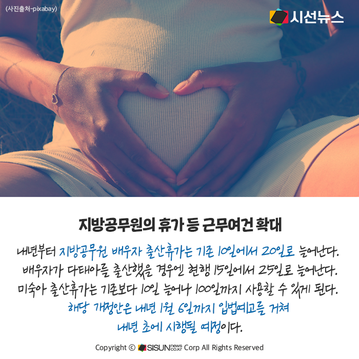 내년부터 지방공무원 배우자 출산휴가는 기존 10일에서 20일로 늘어난다. 배우자가 다태아를 출산했을 경우엔 현행 15일에서 25일로 늘어나며 미숙아 출산휴가는 기존 90일에서 10일 늘어나 100일까지 사용할 수 있게 된다. 해당 개정안은 내년 1월 6일까지 입법예고를 거쳐 내년 초에 시행될 예정이다.