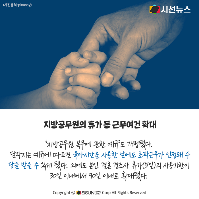 ‘지방공무원 복무에 관한 예규’도 개정됐다. 달라지는 예규에 따르면 육아시간을 사용한 날에도 초과근무가 인정돼 수당을 받을 수 있게 됐다. 기존에는 공무원이 자녀 돌봄을 위해 육아시간을 사용하는 날에는 초과근무를 했더라도 초과근무 시간이 인정되지 않았다. 외에도 본인 결혼 경조사 휴가(5일)의 사용기한이 30일 이내에서 90일 이내로 확대됐다.