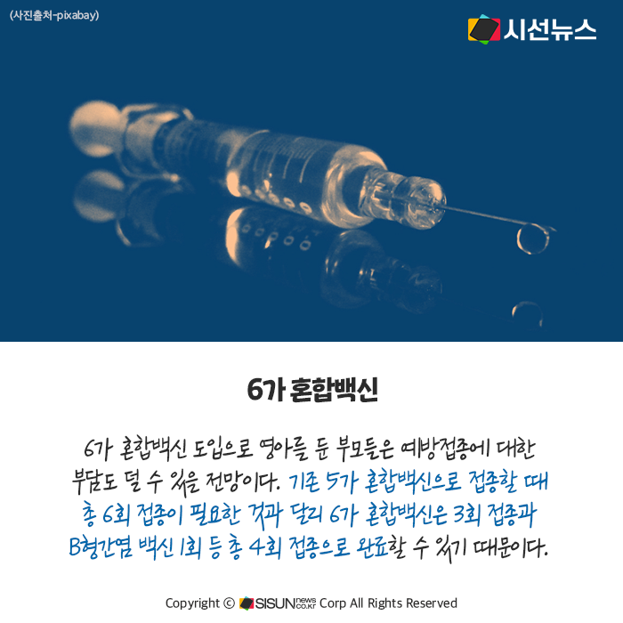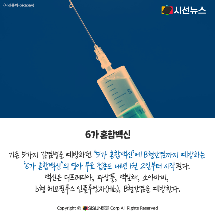 기존 5가지 감염병을 예방하던 ‘5가 혼합백신’에 B형간염까지 예방하는 ‘6가 혼합백신’의 영아 무료 접종도 내년 1월 2일부터 시작된다. 백신은 디프테리아, 파상풍, 백일해, 소아마비, b형 헤모필루스 인플루엔자(Hib), B형간염을 예방한다.