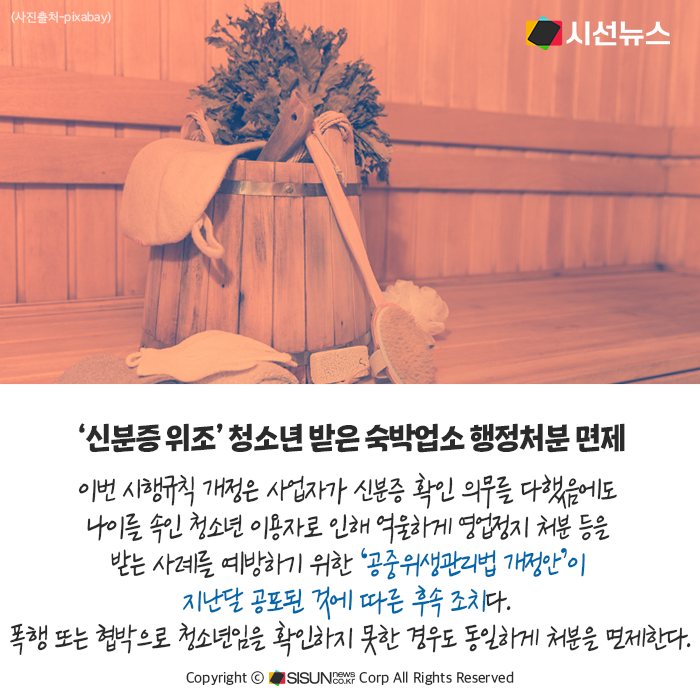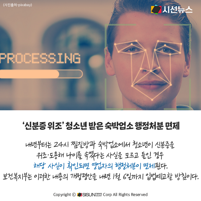 내년부터는 24시 찜질방과 숙박업소에서 청소년이 신분증을 위조·도용해 나이를 속였다는 사실을 모르고 들인 경우 해당 사실이 확인되면 영업자의 행정처분이 면제된다. 보건복지부는 이러한 내용의 개정령안을 내년 1월 6일까지 입법예고할 방침이다.