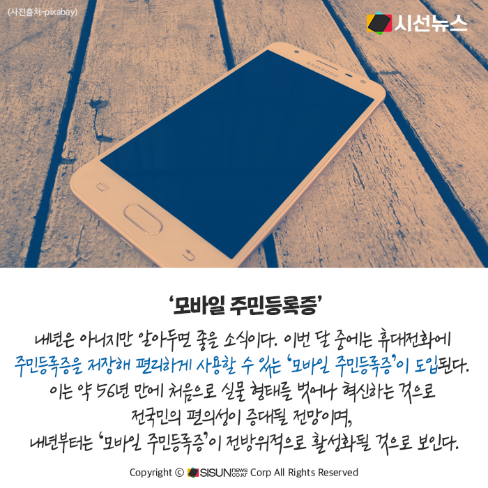 내년은 아니지만 알아두면 좋을 소식이다. 이번 달 중에는 휴대전화에 주민등록증을 저장해 편리하게 사용할 수 있는 ‘모바일 주민등록증’이 도입된다. 이는 약 56년 만에 처음으로 실물 형태를 벗어나 혁신하는 것으로 전국민의 편의성이 증대될 전망이며, 내년부터는 ‘모바일 주민등록증’이 전방위적으로 활성화될 것으로 보인다.