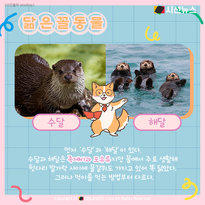 먼저 ‘수달’과 ‘해달’이 있다. 수달과 해달은 족제비과 포유류지만 물에서 주로 생활해 뒷다리 발가락 사이에 물갈퀴도 가지고 있어 똑 닮았다. 그러나 먹이를 먹는 방법부터 다르다. 수달은 미꾸라지, 개구리를 손으로 잡아먹지만 해달은 조개, 성게 등 갑각류를 가슴 위에 놓고 먹는다. 그리고 수달은 머리만 물 밖으로 내밀고 수영하는 반면 해달은 몸을 눕혀 배영으로 수영을 한다. 덩치도 다른데, 수달은 몸길이가 75cm 내외지만 해달은 몸길이 120cm 내외로 수달보다 2배 정도 더 크다.