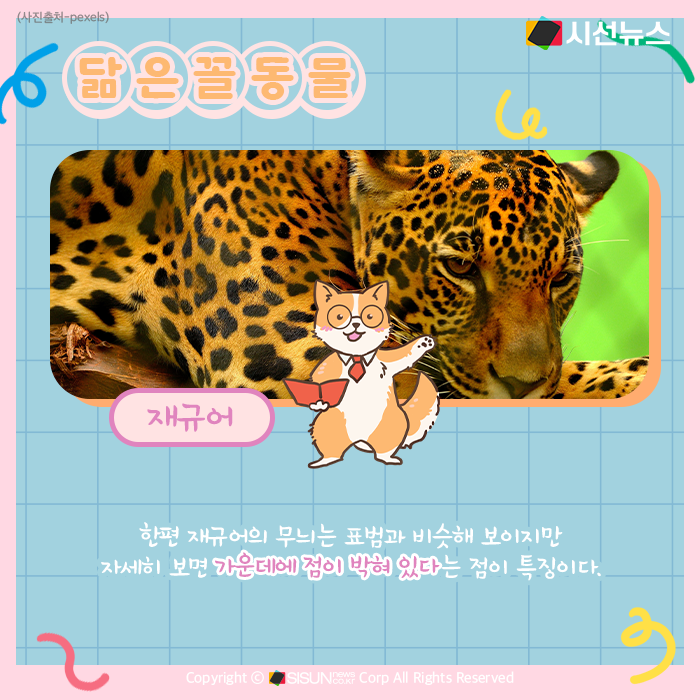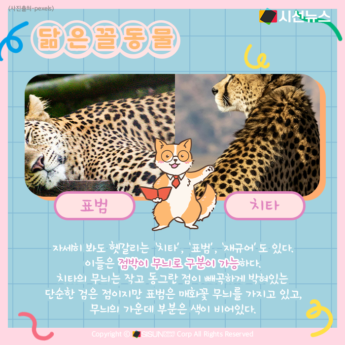 자세히 봐도 헷갈리는 ‘치타’, ‘표범’, ‘재규어’도 있다. 이들은 점박이 무늬로 구분이 가능합니다. 치타의 무늬는 작고 동그란 점이 빼곡하게 박혀있는 단순한 검은 점이지만 표범은 매화꽃 무늬를 가지고 있고, 무늬의 가운데 부분은 색이 비어있다. 한편 재규어의 무늬는 표범과 비슷해 보이지만 자세히 보면 가운데에 점이 박혀 있다는 점이 특징이다.