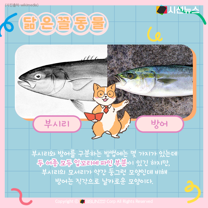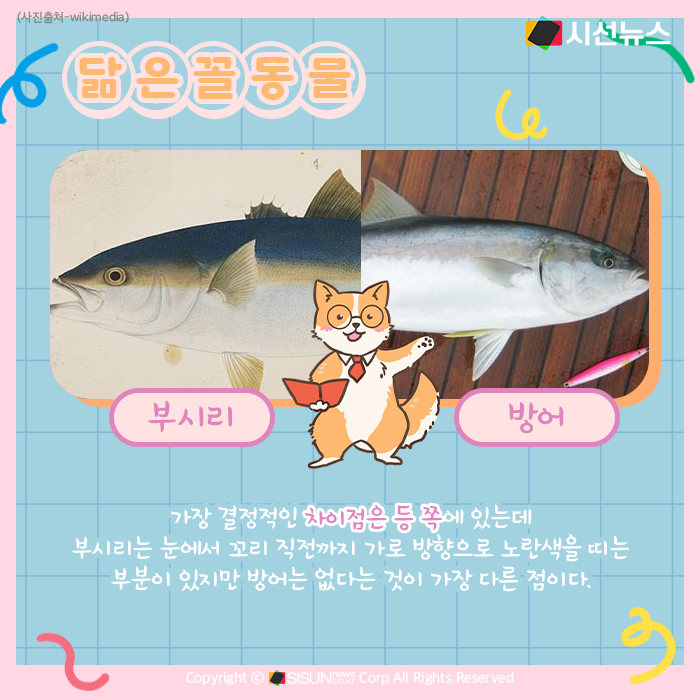 가장 결정적인 차이점은 등 쪽에 있는데 부시리는 눈에서 꼬리 직전까지 가로 방향으로 노란색을 띠는 부분이 있지만 방어는 없다는 것이 가장 다른 점이다. ‘물개’와 ‘물범’ 역시도 비슷한 동물이다. 차이점으로 물개는 작은 귓바퀴가 겉으로 드러나 있지만 물범은 겉으로 드러난 귓바퀴가 없다. 그리고 물개는 앞발로 몸을 세우고 앞발과 뒷발을 내밀며 걸어 다니지만 물범은 배를 땅에 대고 몸을 앞으로 끌면서 기어 다닌다.