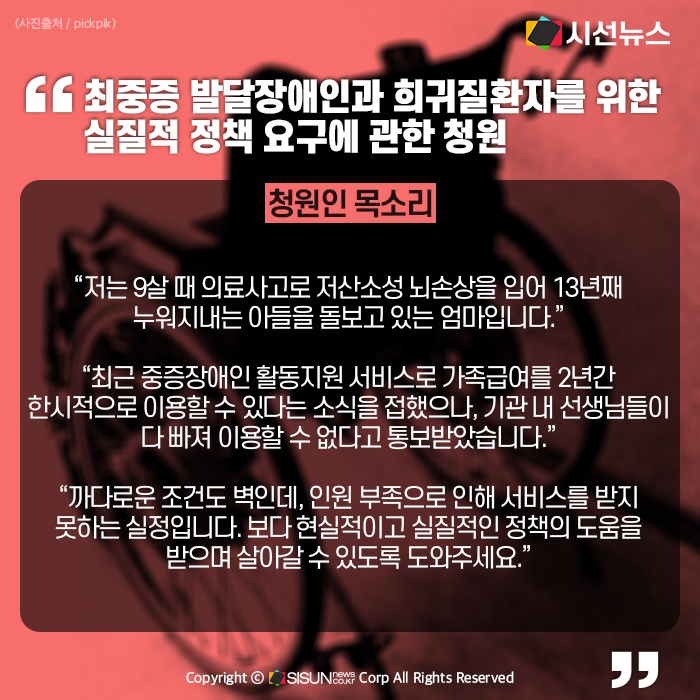 저는 9살 때 의료사고로 저산소성 뇌손상을 입어 13년째 누워지내는 아들을 돌보고 있는 엄마입니다. 오랜 기간 장애인 활동지원을 이용했었다가 코로나 때 면역력이 약한 아이를 보호하기 위해 장애인활동지원 서비스를 중단하고 수년 간 직접 24시간 아이를 돌보고 있습니다.