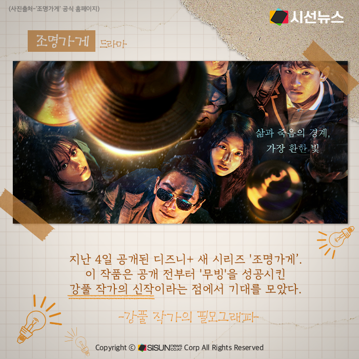 시선뉴스=심재민 기자 / 디자인=김선희 pro | 지난 4일 공개된 디즈니+ 새 시리즈 '조명가게’. 이 작품은 공개 전부터 '무빙'을 성공시킨 강풀 작가의 신작이라는 점에서 기대를 모았다.