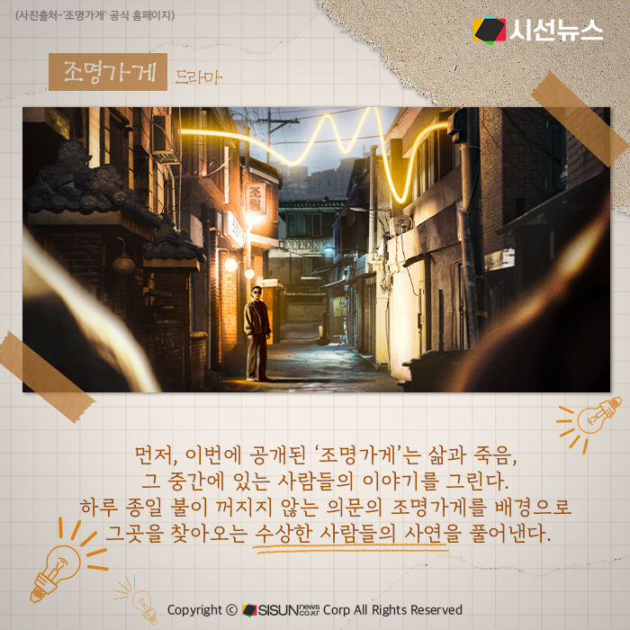 먼저, 이번에 공개된 ‘조명가게’는 삶과 죽음, 그 중간에 있는 사람들의 이야기를 그린다. 하루 종일 불이 꺼지지 않는 의문의 조명가게를 배경으로 그곳을 찾아오는 수상한 사람들의 사연을 풀어낸다. 이 작품은 공개 전부터 '무빙'을 성공시킨 강풀 작가의 신작이라는 점에서 기대를 모았다. 강 작가가 원작 만화에 직접 디테일을 입혀 극본을 완성해, 원작의 감성을 고스란히 살려낸다.