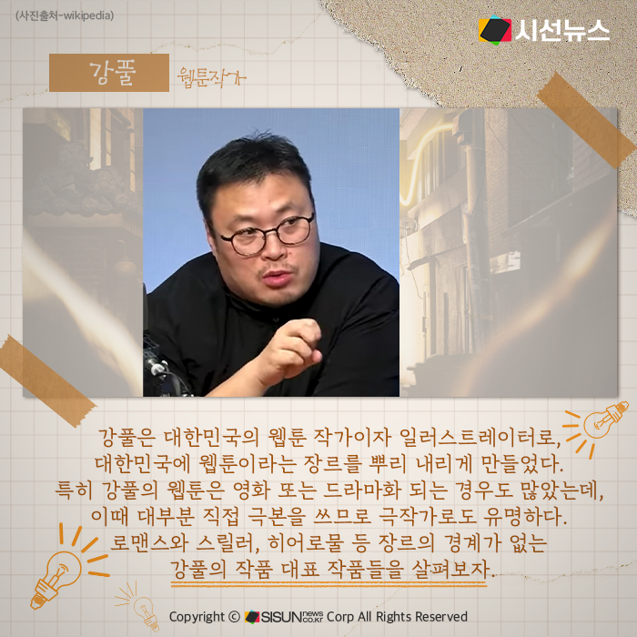 강풀은 대한민국의 웹툰 작가이자 일러스트레이터로, 대한민국에 웹툰이라는 장르를 뿌리 내리게 만들었다. 특히 강풀의 웹툰은 영화 또는 드라마화 되는 경우도 많았는데, 이때 대부분 직접 극본을 쓰므로 극작가로도 유명하다.
