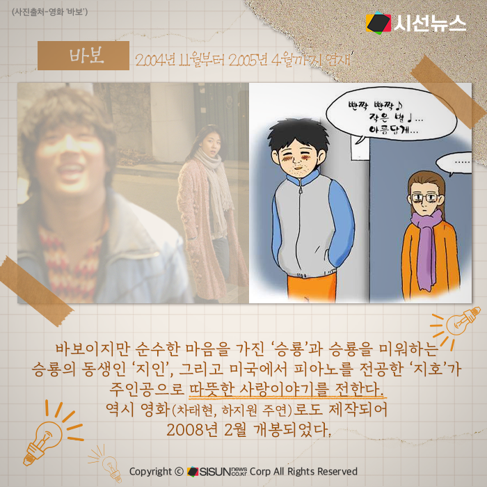 - 바보이지만 순수한 마음을 가진 ‘승룡’과 승룡을 미워하는 승룡의 동생인 ‘지인’, 그리고 미국에서 피아노를 전공한 ‘지호’가 주인공으로 따뜻한 사랑이야기를 전한다. 역시 영화(차태현, 하지원 주연)로도 제작되어 2008년 2월 개봉되었다.