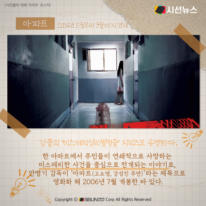 - 한 아파트에서 주민들이 연쇄적으로 사망하는 미스테리한 사건을 중심으로 전개되는 이야기로, 안병기 감독이 ‘아파트(고소영, 강성진 주연)’라는 제목으로 영화화 해 2006년 7월 개봉한 바 있다.