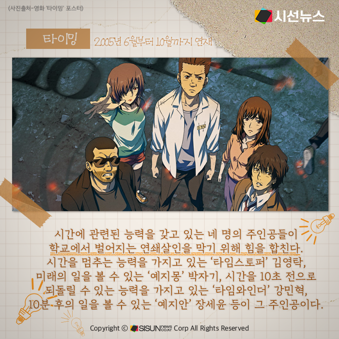 -시간에 관련된 능력을 갖고 있는 네 명의 주인공들이 학교에서 벌어지는 연쇄살인을 막기 위해 힘을 합친다. 시간을 멈추는 능력을 가지고 있는 ‘타임스토퍼’ 김영탁, 미래의 일을 볼 수 있는 ‘예지몽’ 박자기, 시간을 10초 전으로 되돌릴 수 있는 능력을 가지고 있는 ‘타임와인더’ 강민혁, 10분 후의 일을 볼 수 있는 ‘예지안’ 장세윤 등이 그 주인공이다.