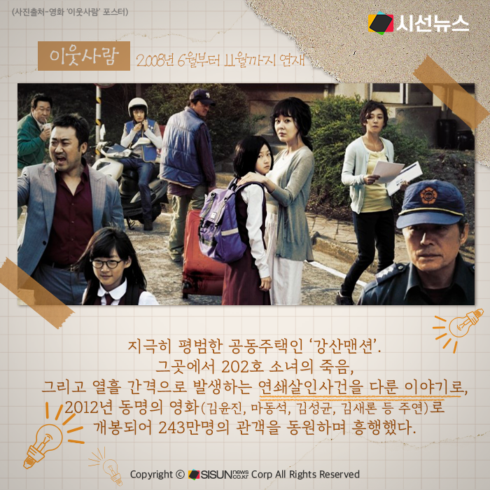 - 지극히 평범한 공동주택인 ‘강산맨션’. 그곳에서 202호 소녀의 죽음, 그리고 열흘 간격으로 발생하는 연쇄살인사건을 다룬 이야기로, 2012년 동명의 영화(김윤진, 마동석, 김성균, 김새론 등 주연) 로 개봉되어 243만명의 관객을 동원하며 흥행했다.