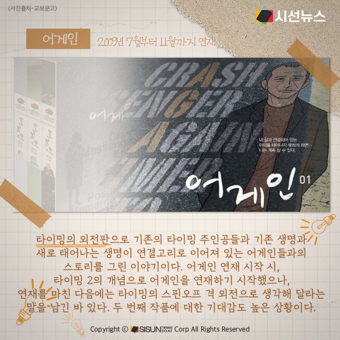 - 타이밍의 외전판으로 기존의 타이밍 주인공들과 기존 생명과 새로 태어나는 생명이 연결고리로 이어져 있는 어게인들과의 스토리를 그린 이야기이다. 어게인 연재 시작 시, 타이밍 2의 개념으로 어게인을 연재하기 시작했으나, 연재를 마친 다음에는 타이밍의 스핀오프 격 외전으로 생각해 달라는 말을 남긴 바 있다. 두 번째 작품에 대한 기대감도 높은 상황이다.