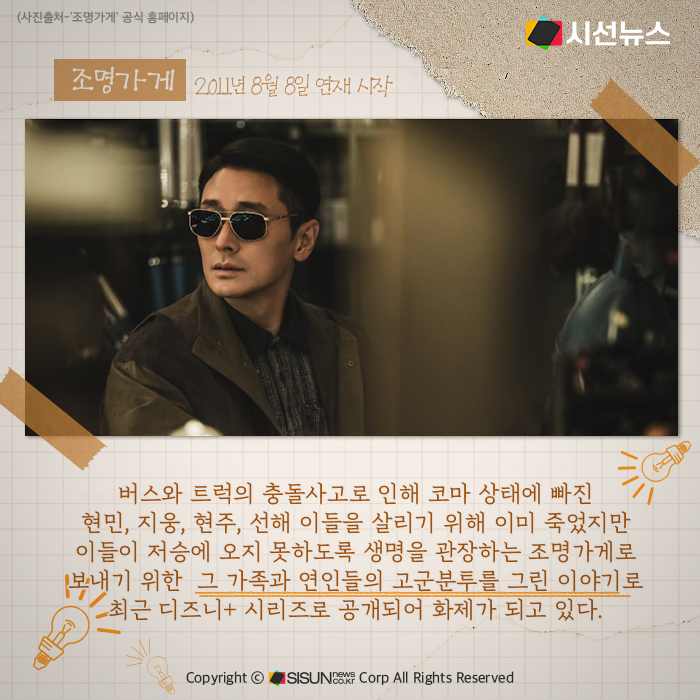- 버스와 트럭의 충돌사고로 인해 코마 상태에 빠진 현민, 지웅, 현주, 선해 이들을 살리기 위해 이미 죽었지만 이들이 저승에 오지 못하도록 생명을 관장하는 조명가게로 보내기 위한 그 가족과 연인들의 고군분투를 그린 이야기로 최근 디즈니+ 시리즈로 공개되어 화제가 되고 있다.