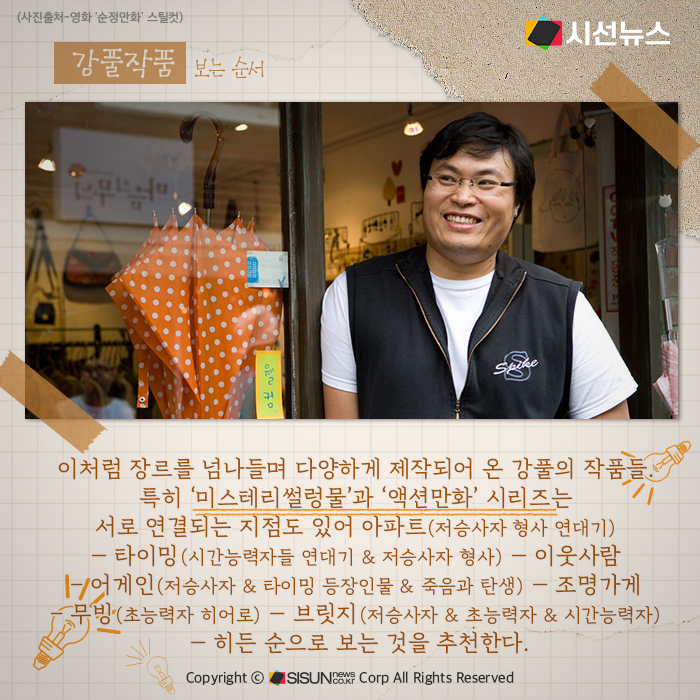 이처럼 장르를 넘나들며 다양하게 제작되어 온 강풀의 작품들. 특히 ‘미스테리썰렁물’과 ‘액션만화’ 시리즈는 서로 연결되는 지점도 있어 아파트(저승사자 형사 연대기) - 타이밍(시간능력자들 연대기 & 저승사자 형사) - 이웃사람 – 어게인(저승사자 & 타이밍 등장인물 & 죽음과 탄생) - 조명가게 – 무빙(초능력자 히어로) - 브릿지(저승사자 & 초능력자 & 시간능력자) - 히든 순으로 보는 것을 추천한다.