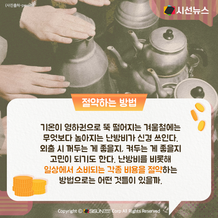 시선뉴스=정혜인 기자 / 디자인=김선희 proㅣ기온이 영하권으로 뚝 떨어지는 겨울철에는 무엇보다 높아지는 난방비가 신경 쓰인다. 외출 시 꺼두는 게 좋을지, 켜두는 게 좋을지 고민이 되기도 한다. 난방비를 비롯해 일상에서 소비되는 각종 비용을 절약하는 방법으로는 어떤 것들이 있을까.