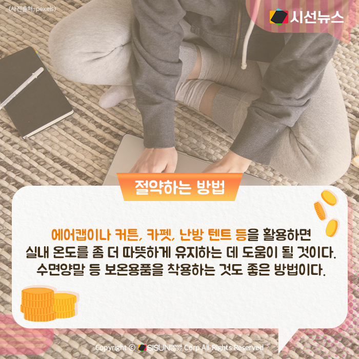 우선 난방비를 절약할 수 있는 가장 좋은 방법은 실내 난방 온도를 18~20도 정도로 설정하는 것이다. 난방비는 20도에서 1도씩 올라갈 때마다 15% 이상 상승한다고 한다. 실내 난방 온도를 1도만 낮게 설정하면 에너지 소비량을 7%를 절약할 수 있다. 에어캡이나 커튼, 카펫, 난방 텐트 등을 활용하면 실내 온도를 좀 더 따뜻하게 유지하는 데 도움이 될 것이다. 수면양말 등 보온용품을 착용하는 것도 좋은 방법이다.
